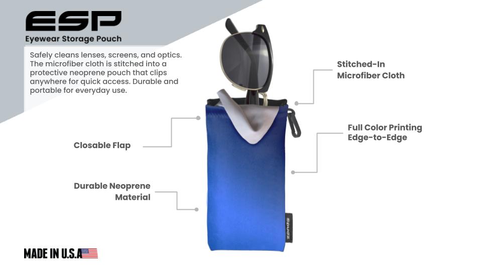 ESP is an Eyewear Storage Pouch made from neoprene with a handy 6″x 6″ microfiber cleaning cloth sewn inside. The ESP protects glasses and sunglasses from bumps and scratches without the inconvenience or bulk of a hard case. ESP- are a complete fun-in-the-sun eyewear kit.