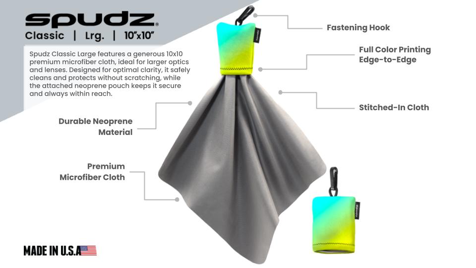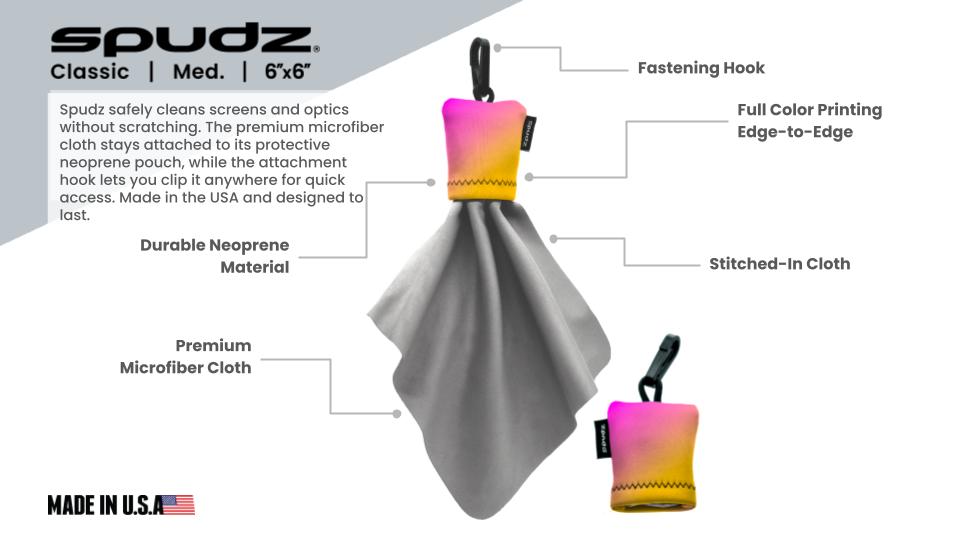 Spudz® is a microfiber cloth and lens cleaner that gets smudges off eyewear, phone screens, tablets, camera lenses, binoculars, and anything else that needs scratch-free cleaning. The premium microfiber cloth stays attached to the pouch and stuffs easily back inside. Get your brand imprinted on our highly recognized and successful product.